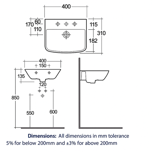RAK Washington 600mm Drop-In Basin – 3 Tap Holes – Alpine White